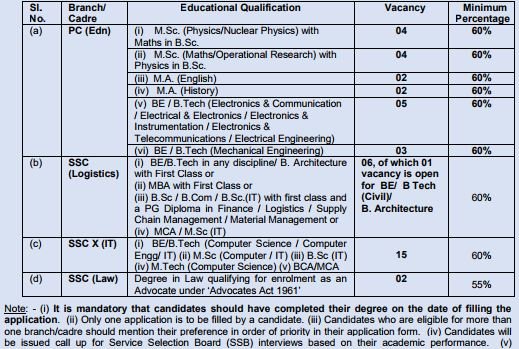 - IHQ of MoD reserves the right to shortlist applications and to fix cut off/based on percentage of marks obtained in BE/B. Tech without assigning any reason. No communication will be entertained on this account.
